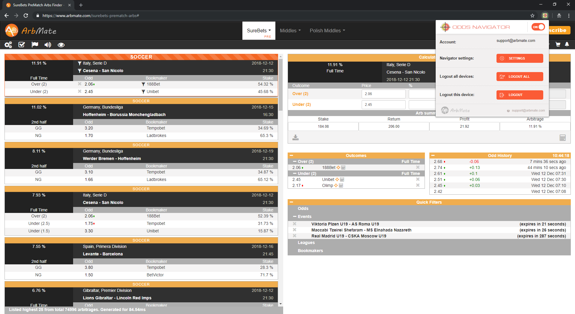 From our experience so far, ArbMate has definitely won a place next to the leading surebets softwares on the market. Below we have summarized it's features till today's date, so you could decide by yourself if it suits your needs. Here is their changelog page in case we have missed something by the day you are reading this review. Enjoy reading!