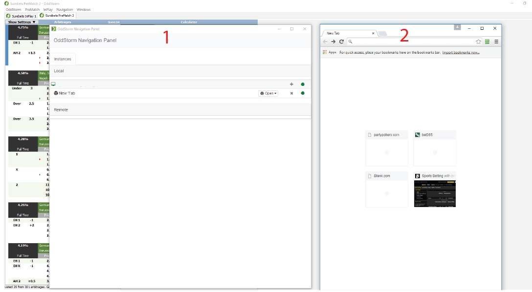 OddStorm's surebet navigation is the only one in the market that is 100% not trackable by the bookmakers. It leads you straight to the betting event page with a single click on the arbitrage. Then all you have to do is to enter the amount and click "bet". The only extra thing you might need to do in order to stay under the radar of the bookmakers is to delete your cookies if it is necessary (including 3th part) before start using it. The navigation could run on a several virtual machines. This means you can navigate with single click on several virtual machines or computers.